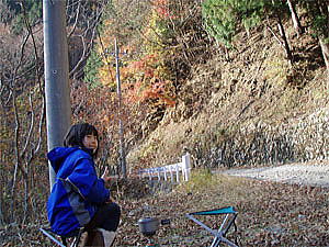 中津峡は道が狭くしかも日陰の場所がほとんど。少しでも日向の暖かそうで広けた場所を探し、そこでバイクを停めた。私がコーヒー、あかりはミルクティーを飲む。私達が温かい飲み物を飲んでいると、この先通行止めになっているにも係わらず、沢山の車やオフロードバイク、それにうち1台はレーシングレプリカのバイクまでもが目の前を通り過ぎた。