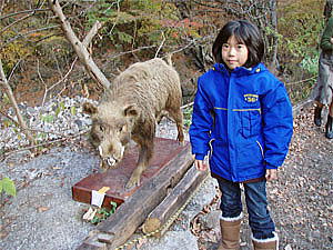 ちなみにここの駐車スペース横には猪の剥製も置かれていて、あかりに「さっき食べたしし汁のお肉はこれのだよ!」と教えると一言、「美味しかったよねぇ〜!」と言って興味深げにじっくり見ていた。
