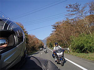 7:20頃に談合坂SAを出発。まだまだ道は空いていて快適に走る事が出来た。空には青空が広がり雲1つ無い快晴だ。気温は低いが富士山の姿もハッキリ見え、皆、気持ち良く走る事が出来た。それにRT3台がきっちりとオフセットのポジションで並んで走る姿もカッコイイ!