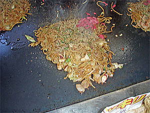 そそ、肝心の焼きそばの方だが、多分、このおかみさんが「うたちゃん」なんだろう。(?)鉄板の上に次々と具や焼きそばを乗せていき手際良く焼き始めた。そして最後に5等分に分け、最後に鰹節の粉をかけて出来上がりとなった。私達は目の前の鉄板から直にお箸で皿に取りながら食べる。 焼きそばは麺にモチモチ感が有ってとても美味しい。そしてもっと美味しく食べる為に一味唐辛子をふりかけて食べる事を勧められる。試しにふりかけて食べてみると、なるほど〜!一味唐辛子をかけても辛くはなく旨みが引き立てられる感じだった。辛いのがあまり得意ではない大貴も、一味唐辛子をふりかけ美味しいと言っていた。