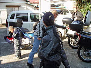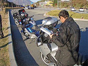 びっきさんはこの日の為に以前から使用していたアマチュア無線機(ハンディ機)をシート下に装着しての参加だ。周波数を決め通信が出来る事を確認する。これで3台共走りながらも色々話しが出来、ルートも相談出来るのでとても便利で楽しくなりそうだ。