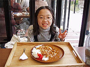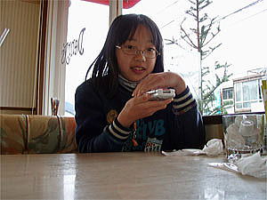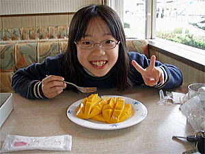 ひかりは家族の中で食べるのが一番ゆっくりなのだが、やっと食べ終わったと思うとひかりは私の携帯電話で遊びだした。携帯電話を開いたり閉じたりすると携帯画面のペンギンの絵が次々に替わるのが気に入っていて、しばらく私の携帯電話をいじって遊んでいた。そしてひかりは食後のデザートとしてマンゴーを注文する。本人いわく、スイカの次にマンゴーが好きなんだそうだ。知らなかった。何時の間にマンゴーの味を覚えたのだろうか?(^^;)
