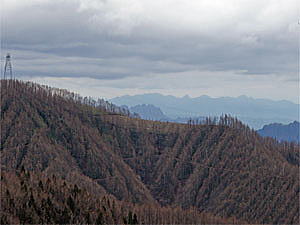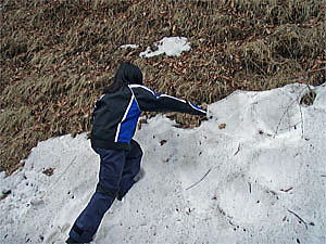 下界では桜が満開でまさに春の景色だったが、十石峠はさすがに標高が高く(1351m)残雪も残り、木々も葉が無い冬景色だった。天気は相変わらず曇り空で日が射さないので余計寂しい景色にも見えるが寒くは感じなかった。展望台から見て写した左上の写真中央には、妙義山の姿も確認出来る。 ひかりは予想通り雪の上を歩き出しはしゃいでいた。