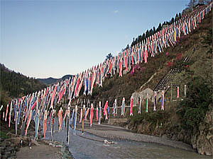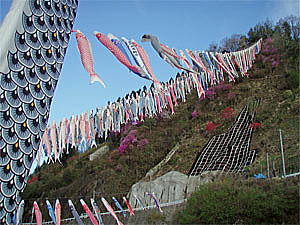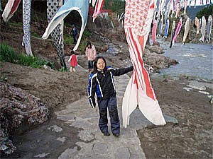 大きな岩が河岸にある 鯉のぼりは近くで見るととても大きい