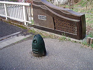こいこいばしには鯉の形をした車止めも有る。橋の欄干にはステンドグラスで鯉の形を彩った飾りもあり、先程の恐竜づくしから一転、鯉づくしの街だった。