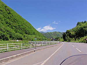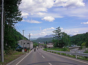 国道19号線を右折し、木曽大橋を超えて国道361号線を開田方面へと向かう。新緑の山々と青空のコントラストが美しく、しかも私達以外車もバイクも走っていないほどの道の空き様だった。この道の走りの気持ち良さは写真を見て頂ければもうお解かりだろう。全てこの写真が物語っている。