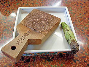 そしてこのお店では嬉しい事に、ライダー限定の大盛りサービスが有った。ざる蕎麦なら2枚分の料金で3枚食べられるのだ。そしてしばらくしてわさびが出された。「本物のわさびが出て来るという事はお蕎麦も本物、お蕎麦屋さんも本物」とよく聞く。これは開田高原なら当然かも知れないが私にとっては久々の本わさびとの遭遇である。(^^) まずは私が代表してわさびをスリスリ・・・。