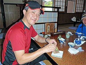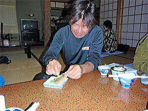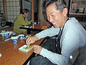 そして次に下田さんに代わりわさびをスリスリ・・・。締めは何時ものゴマすりなら自信が有るが・・・とジョークを飛ばしていた亀ライダーさんもスリスリ・・・。何故か楽しいわさびすりとなった。亀ライダーさんのすり方が一番上手かったのは日頃のゴマすりの技ゆえか?