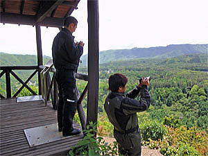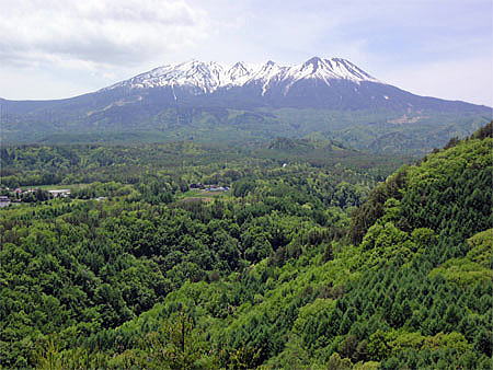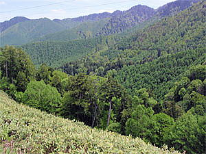 お蕎麦屋さんを出ると目指したのが野麦峠だ。国道361号線を更に奥へと進むと雄大な御嶽山と手前に広大な森林が広がる見晴らしの良い峠に差し掛かった。ここの景色もとても素晴らしい。皆それぞれデジカメを持ち、写真を撮ったり撮りあったりした。 眼下に広がる森林も新緑がとても美しく、綺麗な川の流れなども見え雄大な景色だった。