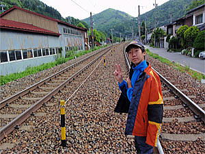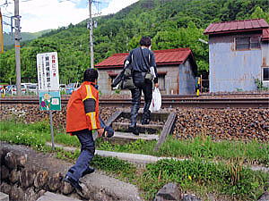 帰り道は駐車場へ向かうのに踏切までは遠いので線路を渡って通過した。人が渡れる様に階段まで作られてはいるが、お年寄りへの警告の為か?「危険につき線路横断禁止」の立て札が設置されていた。当然ながらこの際我々は線路上を横断する。大貴は踏切以外で線路上を渡ったのが初体験だったので喜んでいた。