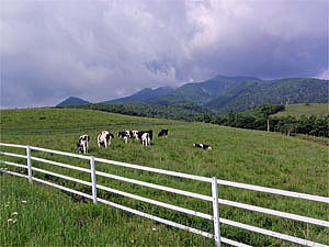 県道169号線を走行し、霧降高原へと上っていく。すると警備員が誘導する駐車場が目に付くようになる。丁度日光キスゲが見頃を迎えており、それで車を誘導していたのだ。走行中遠目に日光キスゲを堪能しそのまま通過する。前を走っていた車は道の真ん中で急に停止するなど駐車場に入るか入らないかで迷っている。さすがにクラクションを鳴らし、せめて道の真ん中を避けろと心の中で叫ぶ。そしてその後見晴らしの良い広い駐車場で少し写真を撮ったりし、また途中牛の写真を撮ったりとゆっくり大笹牧場へと向かった。
