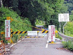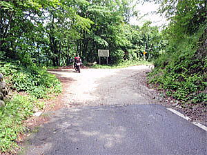 大笹牧場を出て、県道249号線を走行する。土呂部峠への道は舗装されているとは言え路面は石や枝などで荒れていた。スーパーシェルパならではの走破性の高さで余裕で走る。途中、林道支線の入口はゲートでしっかり閉じられ、「行方不明・滑落事故多発」の看板が立っている。(^^;)