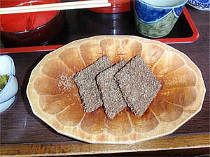 私が立ち寄ったお蕎麦屋さんはちょっと立派な大きなお店だった。ここのメニューは勿論おそばのみ。私は「はっとう」(もち米と蕎麦粉を混ぜ、エゴマをまぶしたお餅の様な食べ物)が付いた「そば定食」を注文する。するとしばらくしておそばが先に出てきた。思っていたよりしっかりとしたボリュームのおそばが出てきた。良心的である。おそばは期待通りに美味しく、自家製のしその薬味もおそばとマッチしていてとても良かった。そして次に出てきたのが問題の「はっとう」。勿論私は食べた事も無ければ見た事も聞いた事もない食べ物だ。チャレンジャーの私はやはり是非食べておきたいと思って定食を選んだのだ。そして一口。ん?温かい。見た目は冷たい食べ物と思ったのだが予想に反して温かい食べ物だった。そしてゴマの風味も良く甘くて美味しい。なるほど〜!こうゆう食べ物か・・・。と思った。