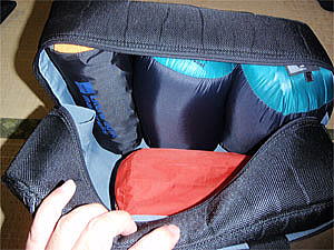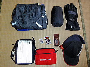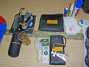 レインスーツ(2着) サマーレイングローブ レザーマン(WAVE) 自家製虫除け薬 ファーストエイドキットなどを メインコンパートメントに収納する。 |