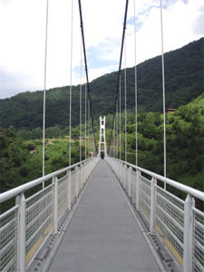 恐竜センターの更に奥へ進むと、天空回廊と言う看板が見えてくる。この天空回廊とは「上野スカイブリッジ」の事で、山と山がつり橋で繋がっている。このつり橋を渡るとまさに天空を回廊している様にも思える場所である。1往復につき¥100掛かるが、その眺めは素晴らしく、橋を渡る途中3箇所では東京タワーと同じ様に足元の下を見られるところもある。眼下には今まで走ってきた道が見え、その高さを十分に味わう事が出来る。