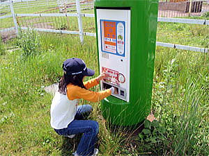 到着後、まずは喉が渇いたのでジュースを飲んだ。夏のツーリングは熱中症対策として水分の補給はこまめにしている。それからふれあい牧場コーナーへと歩いて向かい、100円で売られている動物の餌を購入した。まだこの時点では人がまったく居なく、人間は我々2人だけであった。せっかく餌を買ったのだから近くに居るヤギにあげようとするが、ヤギ達は初めは警戒していて近づこうとしなかった。そこで私が大きな声と身振りでヤギを呼ぶ、初めは無視されていたが餌を持っていることを知ると一斉に近づいてきた。