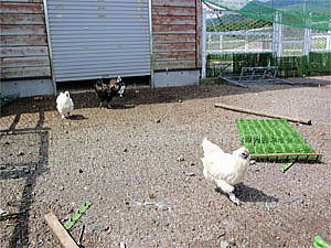 買った餌はあっと言う間に無くなり、次はひかりの大好きなウサギ小屋の方に行く。うさぎ小屋へ行くとお目当てのうさぎが待っていた。早速ひかりがうさぎに葉っぱをあげ始めると、このうさぎ小屋はニワトリが一緒に居る場所でシャッターの隙間から次々と勢い良くニワトリが出てきて出迎えてくれた。(左下写真) ニワトリはウコッケイと言う種類らしく、どうもひかりが普段小学校で世話をしているニワトリと一緒の種類らしい。ニワトリもひかりから餌がもらえるのではないか?と期待し、一目散に走って向かってきた様だ。しかしこのシャッター下から出てきたニワトリの数がとても多く、その数の多さと慌て振りの姿に思わず笑ってしまう。