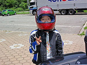 おそばを食べ終わり、バイクのところまで戻るとアンテナの先に赤トンボがとまっていた。ひかりは怖くてトンボが触れないのに何故か目を回そうとする。(^^;)