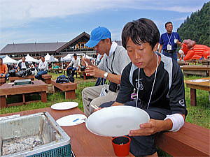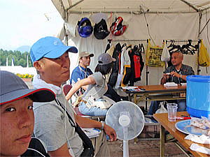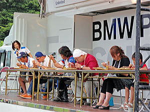 実は白馬へ向かう途中、当日昼に行われる予定の「蕎麦の早食い大会」に出て、お昼はこれで済ませてしまおうと相談していた。テントを設営し、ラフな格好に着替えてから早速受付を済ます。既にお昼近くとなり、お腹が空いていた3人は早く大会が開始されないかと待ち望んでいた。しかし、3人の参加目的はただお蕎麦を食べる事のみ。とても毎年優勝される方々のあの早さには大食いタレントでも勝てる訳が無い。一方takothinさんは試乗を予約していたので早食いには参加しない予定だった。