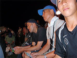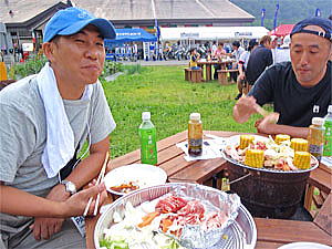 すると早食いの前に毎年恒例の「白馬豚の丸焼き」が振る舞われるための列が出来始めていた。まずは並びtakothinさんを携帯電話で呼び出し合流、ついでに手際良く下田さんが夕食のバーベキューの申し込みを済ませて来てくれた。