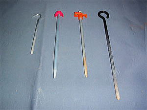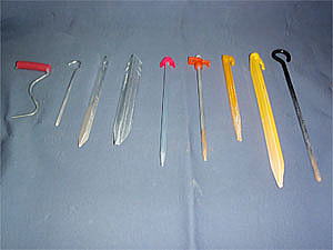 硬くてペグが刺さり難い場所には左の様なピンペグやネイルペグと呼ばれる種類のペグが適しています。