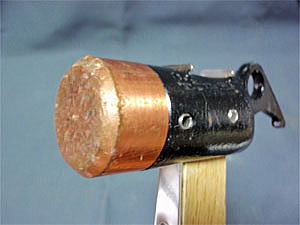 私が愛用しているペグハンマーはこれです。金属製のペグハンマーと言えどもヘッド部は使い込むとご覧の通りです。しかしこのペグハンマーはヘッドが銅製の鍛造仕上げ、柄は丈夫な樫の木で出来ていると言うこだわりぶり。銅製のヘッドは打撃時に手への衝撃を吸収する役目をします。ちなみにヘッド部は交換可能です。重量は670gでバイクツーリング用としては結構重過ぎるのですが、テント設営時の時間が短縮され、手放せない一品となっています。ちなみにこのペグハンマーは税込み¥5,565もします。(^^;)