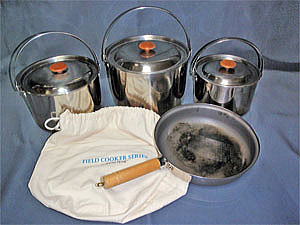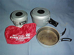 私が所有している大型サイズの軽量のコッフェルはニュートップ製フライヤーコッフェルLです。このコッフェルも20年程前に購入したものですが、カタログ表記では5〜6人用となっておりますが通常使用で4人用位と思えるサイズです。バイクツーリングではあまり出番は有りませんが、次回3人以上となる場合はこれを持って行こうと思います。