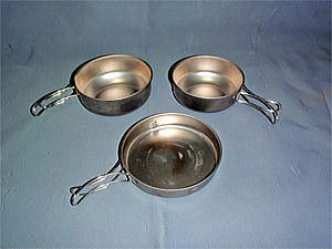 そして普段は皿代わりをメインとして使用しているのがこれです。ソロ用のチタン製食器3点セットです。フライパン(直径14.5cm)は平皿として使用し、カップはご飯や味噌汁用として使用しています。勿論火にもかけられ調理も可能です。(写真でもお判りになれます様にフライパンには火を使った跡がクッキリと出ています。)