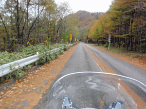 赤城神社へのお参りを済ませ、湖畔の紅葉はとっくに終わっているので先に進むことにした。ここから国道120号線を目指し県道251号線を走行する。この道は濡れた細かい落ち葉が敷きつめられたような路面状況で、何度かタイヤが横滑りしてしまうという緊張を伴った走りを余儀なくされる。