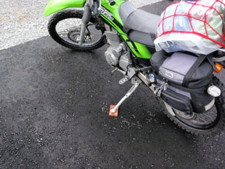 そして更に奥に進み恐山の入口に行った。昨年立ち寄った時には無かった二輪車専用駐車場は真新しく舗装がされており、大型ツアラーでも停めやすい。アスファルトを守るため、駐車場に備え付けのサイドスタンド用の板は必ず使うようにしよう。(右下写真)