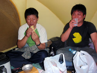 温泉でさっぱりした後は近くのサークルKで酒とつまみを買った後、キャンプ場に戻りテント内での宴会となった。この後は長時間のツーリングだったにも係わらず、結構遅い時間まで楽しく過ごした。それにしてもシンさんとogmさん、お酒好きですねぇ。顔が真っ赤です。(^^)