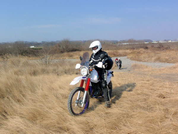 ウォーミングアップ終了後、更にこの広い河川敷コースの奥の方へと進んでみた。下の写真はOSAMUさん。最近YAMAHA TTRを購入し、オフロード走行初参加を果たした。ウェアも新調です。そしてこのTTRに装着されているスクリーン、完成度が高いので市販されているのかと思っていたが、何とハンドメイドだった。素晴らしい出来栄えでした!