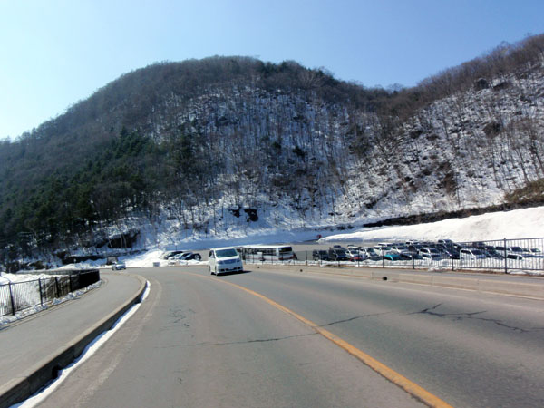国道145号線に入ってからしばらく走るが、前日の暖かさと数日前に降った大雨の影響か?雪の景色が何処にも見当たらない。やっと遠くに見えてきた標高の高い山には雪の面影が見えたのだが、周囲の山は上の方を見ても残雪が全く無い状態だった。