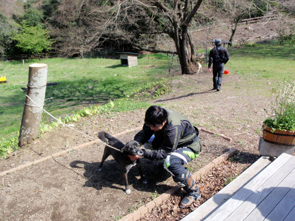 そして「鴨川自然王国」と言う場所に行く。下の写真、「鴨川自然王国」到着と同時にボルドーさんの親指がつったらしく、カメさんに伸ばして貰っている様子。(14:03)