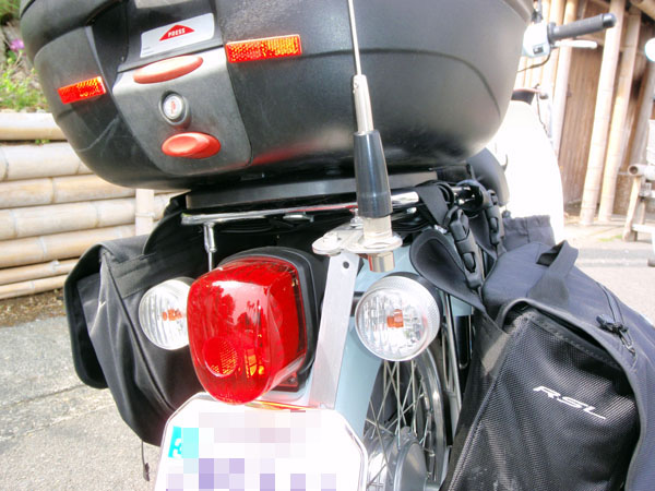 無線機は外部アンテナも装備。振動の多いスーパーカブに対応させる為、ステーの補強がなされている。