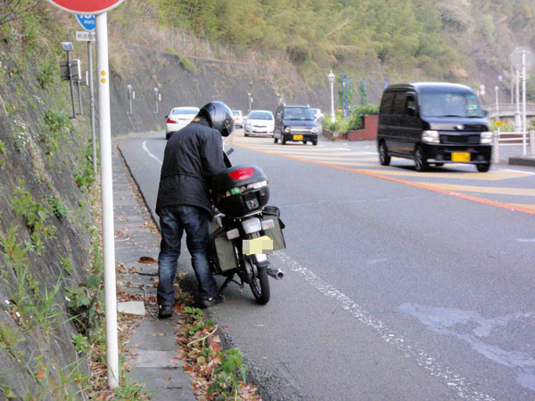 国道414号線から県道17号線(沼津土肥線)に入り海岸線沿いのワインディングロードを快走する。すると、後から大型バイクが近づいてくるとシンさんから無線が入った。私達は左側に寄り、ウィンカーを出して合図を行い道を譲るとハングオンをしながら数台が抜かして行った。