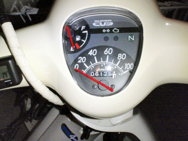 そしてこちらは私のスーパーカブ110。自称「カフェスタイル・ツーリング仕様」ナビに掛けてあるゴムバンドは、走行中の振動でナビの接点不良を防ぐ為。その右下にはモトフィズの温度計付デジタル時計。ホーンSW横には無線機用のトークSW(移動可)。
