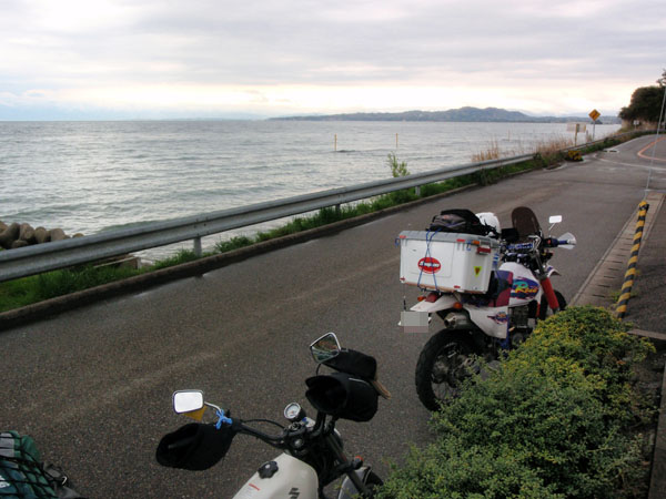 念の為、レインスーツは着ていたが雨は止んだまま。雨中走行を覚悟していたのだが、能登半島の海岸線を快適に走る事が出来た。写真では判り難いかも知れないが、海の向こうに雪を被った立山連峰が見える。
