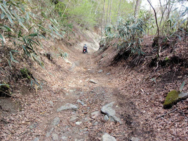 この林道はかなり荒れていた。オフロードバイクでも大変そうな路面状況、それでもスーパーカブは突入する。(8:54)