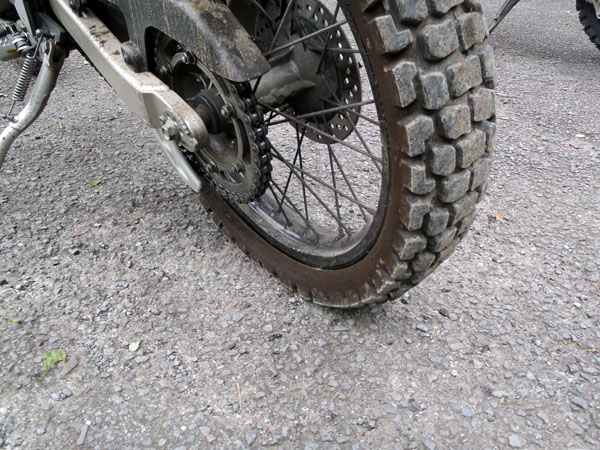 林道終点(舗装されていた)に到着しバイクを停め、リアタイヤを確認すると案の上完全にタイヤが潰れていた。