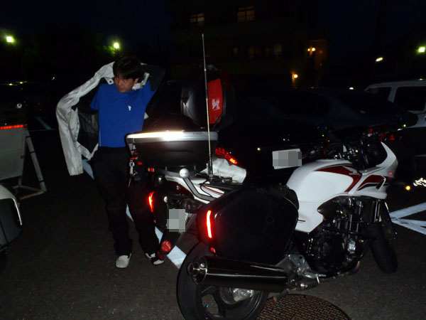 残った私達4人(ボルドーさん、osamuさん、いかりんさん、私)はここで夕食を食べてから帰ることした。結局温泉施設を出発したのが19:30位。既に外は暗くなっていた。下の写真はいかりんさんとCB1300ST。