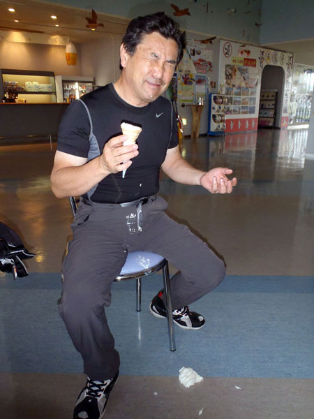 11:00になり、丁度開店したお店でソフトクリームを買って食べた。下の写真はまだ食べ始めたばかりなのに、痛恨のソフトクリーム落下。(爆) しかも落ちた場所が悪かった。(^^;) 「早く写真撮って~!」と言ったMk73さん、しっかりツーレポ載せましたよ。(笑)