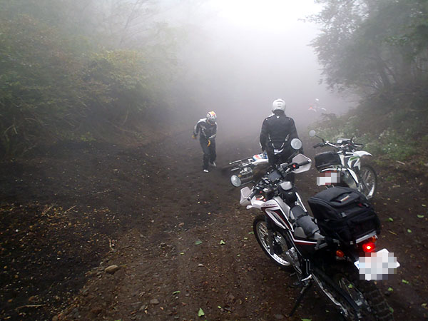 そして林道に突入。う~ん 前が見えない。(--;) あまりにも霧が濃いためヘルメットのシールドも曇ってしまう。それにしてもこの道、サラサラの火山系の砂でしかも深い。ハンドルを取られるだけでなくタイヤが砂に埋まる程。(^^;)