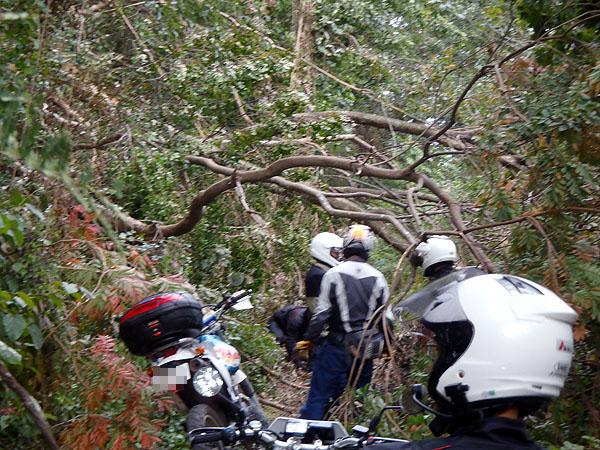 崖崩れの方はそれ程でもなかったが、その崖崩れにより多くの木が倒れて完全に道を塞いでいた。(爆)