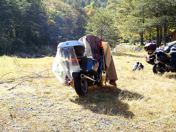 テントの撤収の仕方は人によって多種多様。テントをバイクに立て掛ける方が居るかと思えば・・・