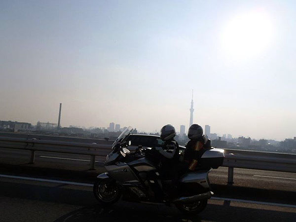 大分走ったところでMAEDAさんは久喜ICで国道16号線へとお別れ。そしてボルドーさんは飛ばし過ぎで燃料警告ランプが点灯し途中離脱。K1200GTは飛ばすと燃費が急速に悪化するのだ。結局大型バイク最後尾を走っていた私もやっとosamuさんに追いつき、osamuさんと私達の2台で首都高速湾岸線(B)を目指した。下の写真は首都高速道路を湾岸線方面に走行中、スカイツリーをバックにosamuさんが撮影してくれた写真だ。