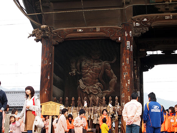 気を取り直して次に向かったのは「ぱてぃお大門 蔵楽庭」方面。目的は「おやき」だ。 その途中、通った仁王門には見応えのある像が見れる。