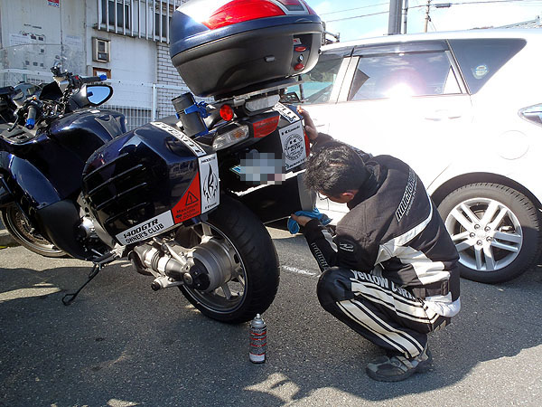 ちなみに私達がちかぶさんを誘導する最中、このお方は更に愛車に磨きを掛けていた。(笑) マフラーまでふきふきしているosamuさん。 ついでに私のも・・・ とお願いしたい。(^^)