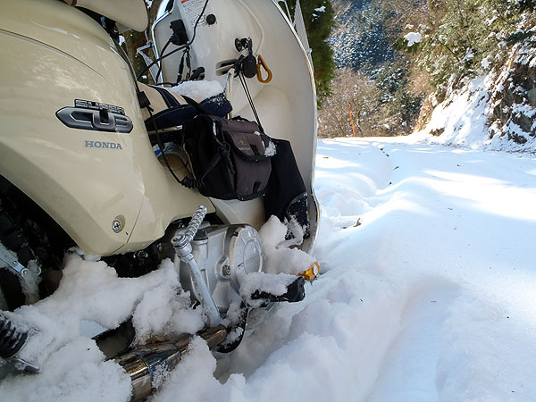 轍が消えた後の雪道走行はとにかく大変だった。雪が深すぎてステップやレッグシールドに雪の抵抗を感じだし、次第にラッセル状態となり前に進み難くなったのだった。(爆) 気温は低いのに汗だくとなる。その訳はスーパーカブが雪の抵抗で進まない分足でも漕ぐからだ。