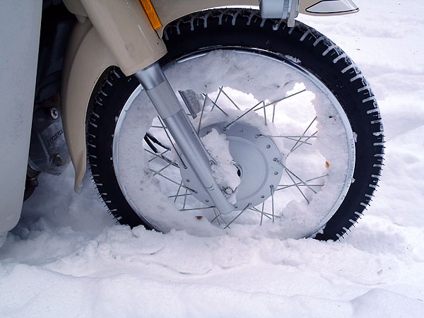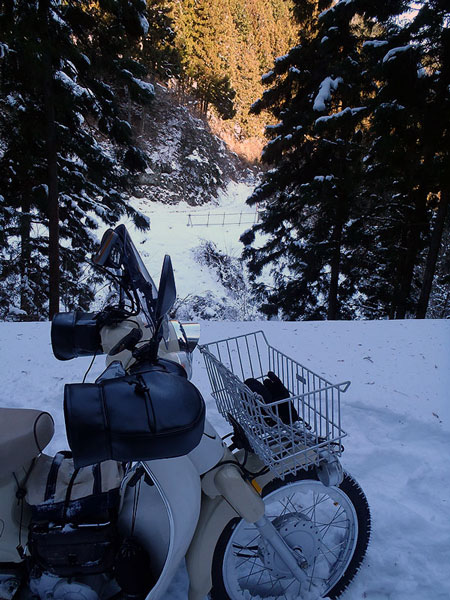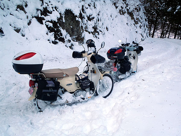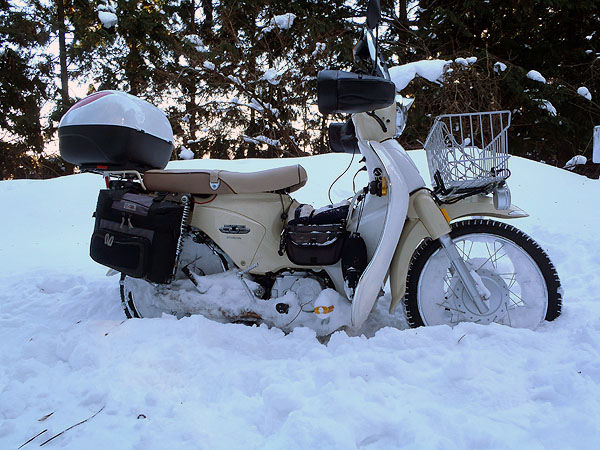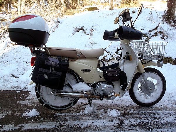 私がスーパーカブ110を購入する1つのきっかけとなったのは、2010年2月に行ったオフロードバイク(スーパーシェルパ)でチャレンジした雪道走行の失敗がある。(^^;) 雪道走行に強いバイク = スーパーカブ110と考えたのだ。 そんなスーパーカブ110を購入して早1年半程が過ぎ、今シーズンはスーパーカブ110で本格的な雪道を走行しようと考えていた。